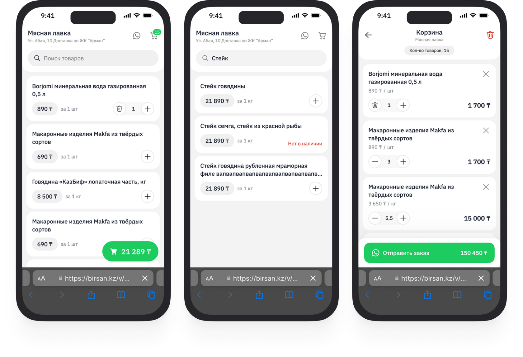 Клиент смотрит витрину, собирает корзину и по кнопке «Отправить заказ» пишет вам в WhatsApp. Вы оформляете заказ в Birsan как обычно.