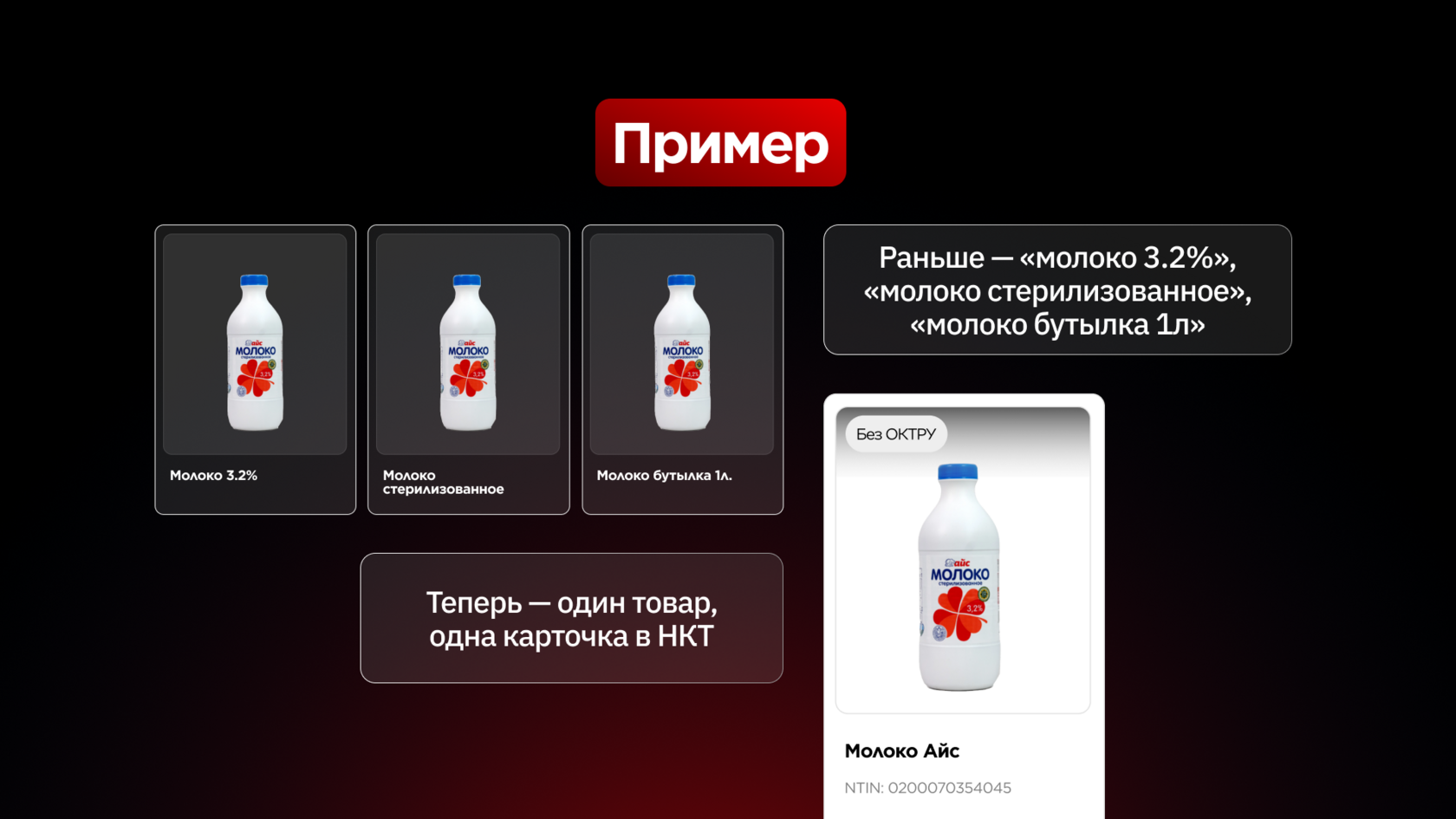 Раньше товар с одним GTIN мог иметь разные названия (например: “молоко 1 л”, “молоко 3.2%”, “молоко пастеризованное”), из-за чего могли возникать ошибки в учете.
